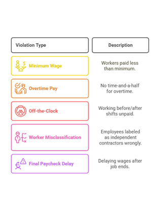Unpaid wage lawsuits often boil down to five key violations. Here’s a breakdown:
